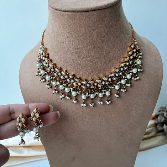 Pearly White Kundan Gold Toned Necklace Set